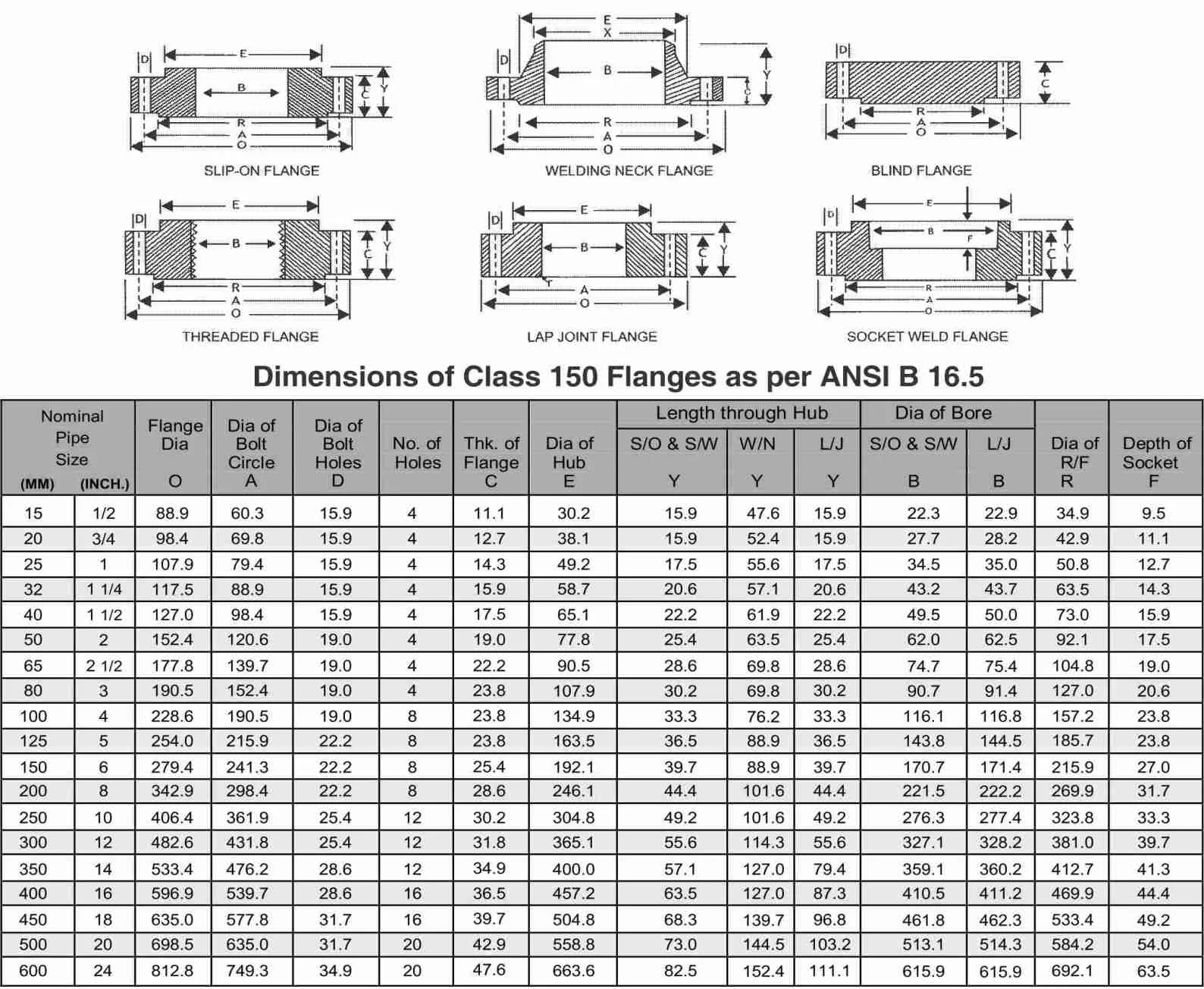 | ASME B16.5 | Weld Neck, Slip-On, Socket Weld, Threaded, Lap Joint, Blind, Orifice | Class 150, 300, 400, 600, 900, 1500, 2500 |